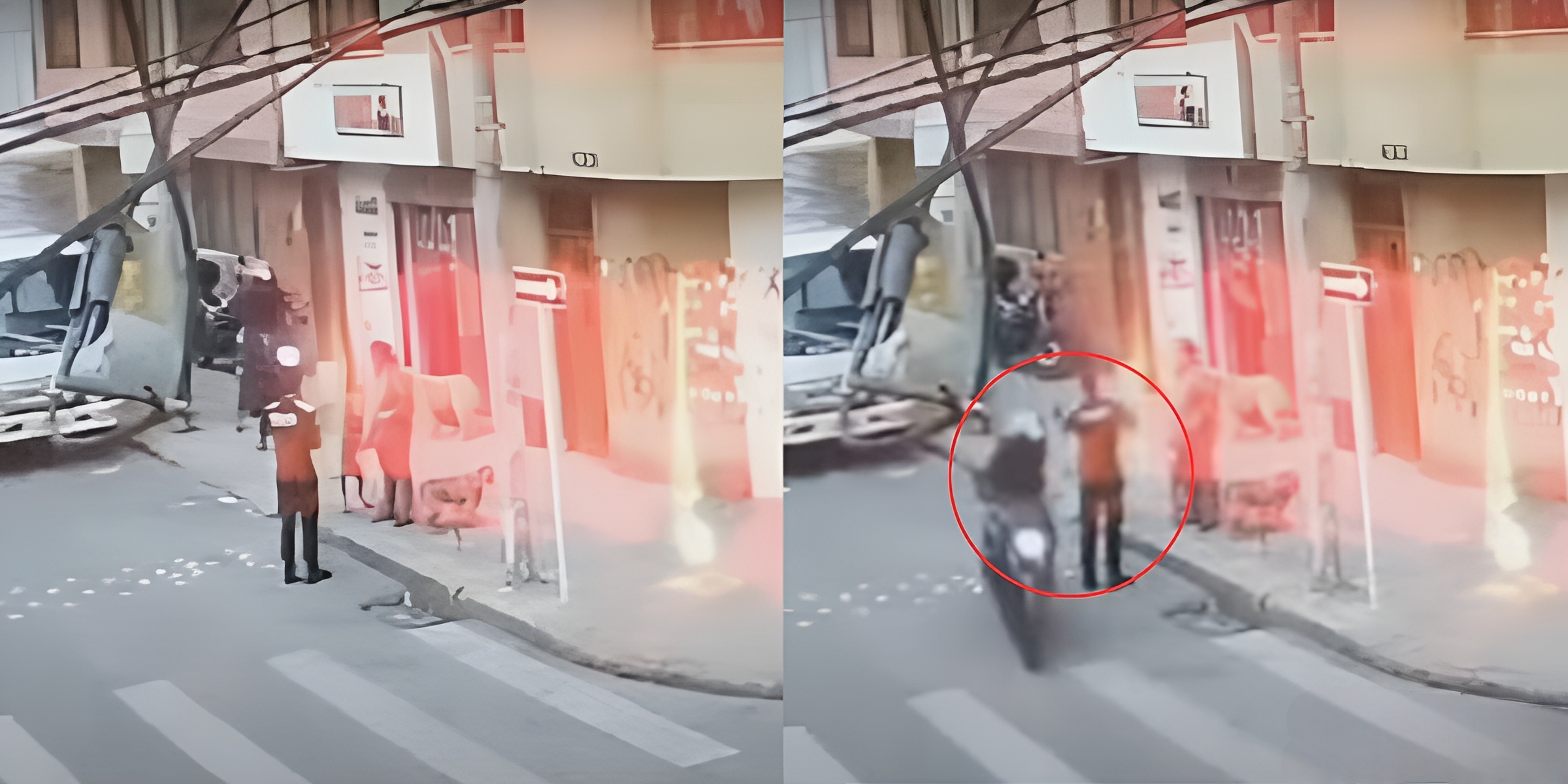 En el video, se ve que un sujeto a bordo de una motocicleta se sube al andén, estudia rápidamente la situación y pasa junto a un policía, quien se encontraba en la vía pública hablando con una mujer.