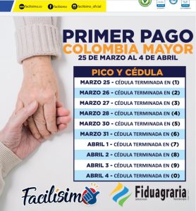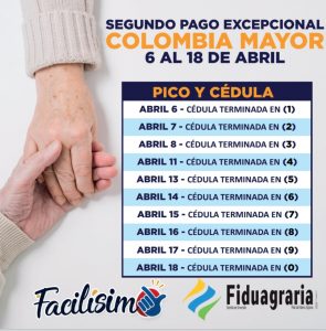 Mediante el decreto 417 del 17 de marzo de 2020, reglamentado por el gobierno nacional, que dispone el aislamiento preventivo y obligatorio para los adultos mayores de 70 años, pero que también contempla excepciones especiales, entre ellas el cobro del subsidio de Colombia Mayor, la Empresa FacilíSimo informa que tal como lo estipula el precitado decreto, los beneficios del Programa Colombia Mayor, recibirán el pago del Subsidio de la siguiente manera: