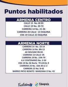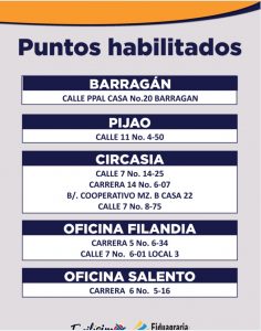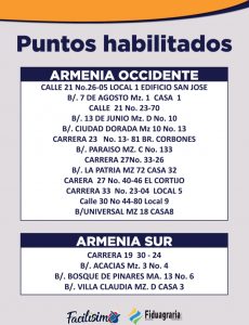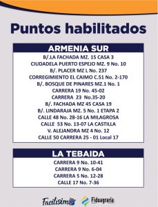- Habilitación de 80 puntos en todo el Quindío distribuidos en los doce municipios y en las zonas centro, occidente, sur y norte de la ciudad de Armenia.