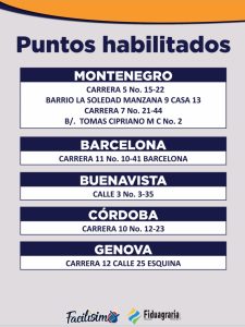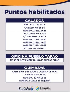 - Después del sábado 18 de abril, último día de pago de carácter excepcional, se habilitarán el 100% de nuestros puntos en todo el departamento del Quindío, hasta el 30 de mayo de 2020, para que reclamen el subsidio quienes no lo hayan hecho. De esta manera, la empresa FacilíSimo evitará que existan aglomeraciones de personas que reclamen el subsidio y se acortará distancias entre los beneficiados, para que realicen esta diligencia de la mejor manera. Oficina de Comunicaciones Red de Servicios del Quindío-FacilíSimo