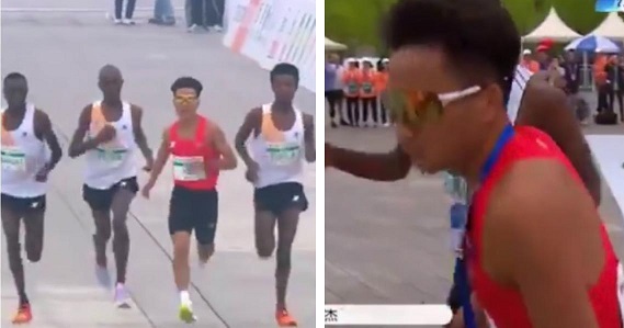 En los videos de la carrera en el momento en que están a punto de llegar a la meta, se ve a He Jie, de 25 años, por detrás a cierta distancia de los kenianos Robert Keter y Willy Mnangat y del etíope Dejene Hailu. Pero esos tres atletas parecen bajar el ritmo y el atleta chino los adelanta en el último momento, ganando así la media maratón con un segundo de distancia.