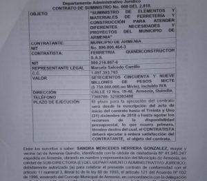 El primer contrato, no fue por 160 millones, tal y como denuncia el Sargento Castillo Dussan, Periodismo Investigativo descubrió que este contrato en realidad se celebró en agosto de 2018, por la suma de Setecientos Cincuenta y nueve millones de pesos ($759’000.000,00) cuyo objeto fue ‘’SUMINISTRO DE LEMENTOS Y MATERIALES DE FERRETERÍA Y CONSTRUCCIÓN PARA ATENDER DIFERENTES NECESIDADES Y PROYECTOS DEL MUNICIPIO DE ARMENIA’’, entregado por la Dra. SANDRA MERCEDES HERRERA GONZALES en su calidad de Sudirectora (e) del Departamento Administrativo Jurídico de la alcaldía de Armenia, a nombre de la Ferretería QUINDICONSTRUCTOR S.A.S. ubicada en la Calle 12 No 19-40 de Armenia, Quindío, cuya representante legal es la señora Marcela Salcedo Carrillo, este contrato se entregó bajo la figura de un PROCESO DE SELECCIÓN ABREVIADA POR SUBASTA INVERSA y en el cual participaron cinco oferentes: EQUIFERSEC S.A.S. , SOLUCIONES Y SUMINISTROS AM S.A.S. , MARÍA DEL CARMEN GRANADA GÓMEZ, TECNOLOGÍA MODULAR y el ganador QUINDICNSTRUCTOR S.A.S.