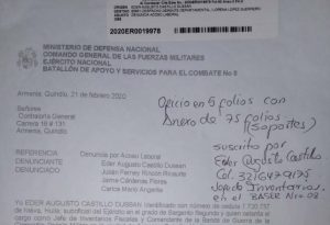 El sargento Eder Castillo había colocado la queja en la Procuraduría Regional del Quindío y en la Contraloría General del Quindío de manera anónima y al parecer esta información se filtró y habrían presuntamente puesto en alerta al Comandante del Batallón y con el recurso del nuevo contrato 010 por $483 millones, subsanaron parte del objeto del contrato 008, que no habían ejecutado, de esta manera se deduce que el objeto del nuevo contrato (010), tampoco se habría ejecutado en su totalidad, los altos mandos se cambian de puestos claves dentro de la Institución para lograr sus propósitos, nunca le permitieron al denunciante para que se capacitara, el arriendo por valor de un millón de pesos, de un local comercial llamado ‘’lucho’’ que funcionó todo el mes de febrero de 2020, ubicado dentro de la institución, solo están cobrando desde marzo y el arrendatario le entregó ese arriendo en efectivo al Coronel y este no le dio entrada al CENAC y ahora el dinero está enredado por no legalizarse su entrada.