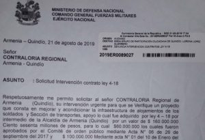 - Solicita a la Procuraduría Regional del Quindío y a la Contraloría General de la República gerencia seccional Quindío, para que se pronuncien frente a las quejas radicadas allí desde agosto de 2019 por presunta corrupción derivada del contrato 008 efectuado el 31 de diciembre de 2018 por 160 millones de pesos, en el cual habría gravísimos hechos de c- orrupción que tendrían que ver con el mantenimiento de los alojamientos del Batallón en mención.