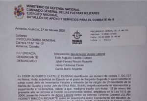Un grupo de soldados subió hace varios meses a las redes sociales otro video denunciando que en el Batallón de servicios No 8 Cacique Calarcá, les estaban haciendo un descuento injustificado sobre las bonificaciones, el video lo hizo el Primero Muñoz ya pensionado y por ello le dieron la baja sin permitirle su legítima defensa, pide que se investigue la hidrolavadora, aparecieron unas guadañas totalmente desvalijadas, sin número fiscal, sin número de serie con partidas de combustible por varios millones de pesos, presentó la queja a su superior el Mayor Parra y lo que hicieron fue eliminar el centro de costo de las guadañas y lo traspasaron el centro de costos fijos, el Sargento Eder Castillo solicita que se investigue en donde está el dinero de la devolución de los alimentos de los soldados que salieron de permiso durante el año 2019, pues al parecer, a ninguno se los consignaron.