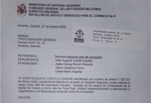 El Sargento segundo Eder Castillo Dussan orgánico del batallón de servicios No 8 Cacique Calarcá con sede en la Ciudad de Armenia, decidió publicar un video, en el cual da a conocer parte de los presuntos hechos de corrupción que habrían ocurrido al interior de la Institución armada a la cual pertenece.