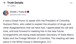 El choque entre estas dos posturas perdió relevancia cuando desde la Cancillería informaron que Petro y Trump hablaron por alrededor de 45 minutos para llegar a acuerdos de cooperación. A través de su red social Truth, el gobernante norteamericano dijo que fue un “placer” hablar con su homólogo y anunció una próxima cita presencial.