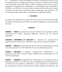 Otro de los argumentos contenidos en el fallo de tutela está relacionado a que “el derecho a la información es una prerrogativa constitucional cuyo ejercicio no puede ser obligatorio, sino libre y, por lo tanto, se vulnera, como ocurrió en este caso, cuando se cercena la posibilidad de no acceder a la información difundida en los consejos de ministros y la única opción para las personas consiste en excluirse, apagando el aparato, del acceso al servicio público de televisión”.
