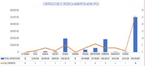 En la siguiente gráfica se muestra el total invertido hasta el 13 de abril por parte de los municipios para atender la urgencia manifiesta, así como el número de contratos en cada uno de ellos.