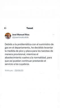 “Debido a la problemática que se presenta con el suministro de gas en el departamento del Quindío, he decidido levantar el pico y placa de los taxis para que puedan cumplir con la demanda que se tiene del servicio; esto hasta el momento en que se solucione, de manera definitiva, la problemática del gas”, declaró Ríos Morales.