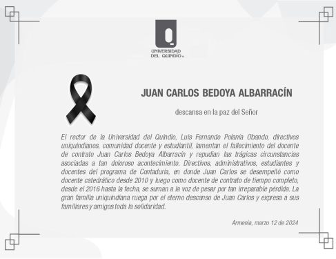 ”El rector de la Universidad del Quindío, Luis Fernando Polanía Obando, directivos uniquindianos, comunidad docente y estudiantil, lamentan el fallecimiento del docente de contrato, Juan Carlos Bedoya Albarracín y repudian las trágicas circunstancias asociadas a tan doloroso acontecimiento. Directivos, administrativos, estudiantes y docentes del programa de Contaduría, en donde Juan Carlos se desempeñó como docente catedrático desde de 2010 y luego como docente de contrato de tiempo completo, desde 2016 hasta la fecha, se suman a la voz de pesar por tan irreparable pérdida. La gran familia uniquindiana ruega por el eterno descanso de Juan Carlos y expresa a sus familiares y amigos toda la solidaridad”, Comunicado Uniquindío.