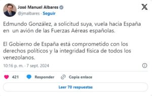 José Manuel Álbares, ministro de Exteriores de España, afirmó luego en su cuenta de X que el opositor Edmundo González viaja hacia esa nación europea en un avión de la Fuerza Aérea de España.