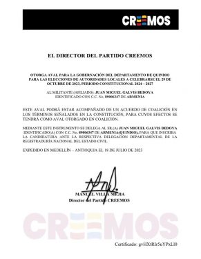 El documento confirmando el aval, fue expedido con fecha 18 de julio de 2023 y firmado por el director del partido ‘Creemos’, Manuel Villa Mejía