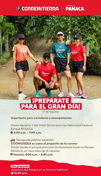 Por esta razón, nos permitimos informarles que el próximo domingo 17 de agosto del 2025, la vía que comunica el municipio de Quimbaya con el Parque PANACA estará cerrada temporalmente con motivo de la realización del evento deportivo de running ‘CorreMiTierra’ experiencia PANACA.