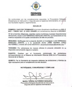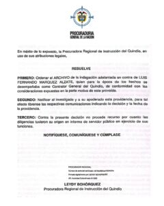 La Procuraduría General de la Nación notifica al Ex Contralor del Quindío Dr. Luis Fernando Márquez Alzate, el tercer y último fallo a su favor.