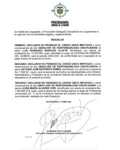 PRIMERO: Declarar NO probado el cargo único imputado y como consecuencia de ello absolver de responsabilidad disciplinaria al señor Luis Fernando Márquez Alzate, quien ostentaba el cargo de Contralor General del Quindío, para el periodo 2020 – 2021, de conformidad con lo expuesto en la parte motiva del presente proveído.