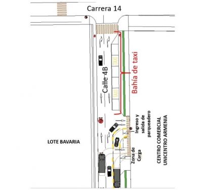 Las puertas de ingreso y salida, como las de acceso y maniobra de transporte de carga mantienen su orientación, pero se genera la instalación de dispositivos de señalización y demarcación, que permitan orientar el flujo y evitar accidentes, mitigando las alteraciones en la movilidad que se puedan generar con las filas de espera para el ingreso al centro comercial. De igual forma, se propone una bahía de taxis sobre el costado derecho de la calle 4B, en la zona cercana a la intersección con la carrera 14.