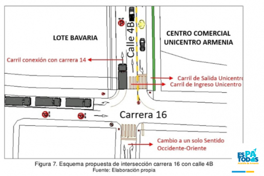 De esta manera, tras el desarrollo de un riguroso estudio de ingeniería vial se determinó que, una vez esté listo el decreto, el habitual giro a la derecha sobre la Avenida Bolívar para ingresar a Unicentro, luego de descender el puente de la calle 2da, ya no estará permitido. Este cambio del sentido vial sobre la calle 4B será entre las carreras 14 y 16, habilitando tres carriles de circulación vehicular, así como el cambio en el sentido vial de la calle 4B, entre carrera 16 y 17, que se establecerá en dos carriles en sentido de circulación occidente y oriente, como se ilustra en el gráfico: