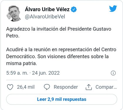 “Agradezco la invitación del presidente Gustavo Petro. Acudiré a la reunión en representación del Centro Democrático . Son visiones diferentes sobre la misma patria”, trinó el exmandatario esta mañana de viernes.