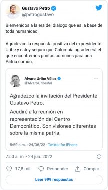 “Bienvenidos a la era del diálogo que es la base de toda humanidad. Agradezco la respuesta positiva del expresidente Uribe y estoy seguro que Colombia agradecerá el que encontremos puntos comunes para una Patria común”, escribió.