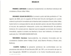 “Dejar sin efecto el numeral cuarto del fallo proferido el 1° de agosto de 2025, por el Juzgado 44 Penal del Circuito de Bogotá, en cuanto ordenó la privación inmediata de la libertad del ciudadano Álvaro Uribe Vélez; hasta tanto la correspondiente sala de decisión penal, de este Tribunal defina el recurso de apelación interpuesto contra esa determinación de primera instancia. En consecuencia, disponer que el juzgado accionado de manera inmediata, expida la boleta de libertad a favor del tutelante”, se lee en el documento.