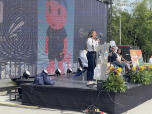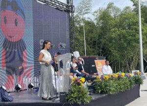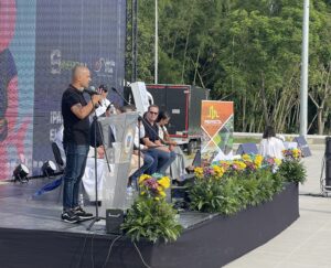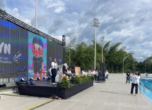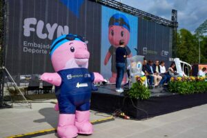 Durante la inauguración protocolaria del Complejo Acuático, la empresa Myrtha Pools, realizó la presentación de Flynn, el delfín rosado inspirado en esa especie del Amazonas colombiano, que desde el Quindío ahora hace parte de esta importante marca como mascota de los deportes acuáticos.