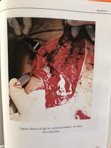 Aspecto oleoso del musculo impregnado de material extraño, silicona líquida, además de múltiples microgranulomas encapsulado gel