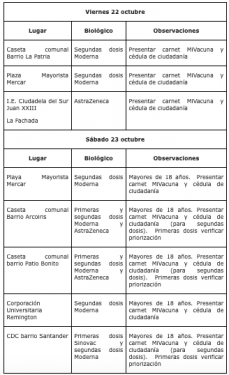 Hoy viernes 22 y mañana sábado 23 de octubre se realizarán diferentes jornadas de inmunización de primeras y segundas dosis, por parte de la secretaría de Salud, entre las 8:30 a.m. y la 1:30 p.m. de la siguiente forma: