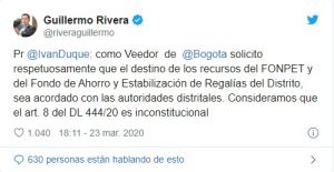 Pr @IvanDuque: como Veedor de @Bogota solicito respetuosamente que el destino de los recursos del FONPET y del Fondo de Ahorro y Estabilización de Regalías del Distrito, sea acordado con las autoridades distritales. Consideramos que el art. 8 del DL 444/20 es inconstitucional