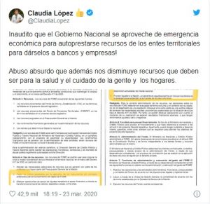 La alcaldesa de Bogotá, Claudia López, manifestó su enorme desacuerdo sobre el decreto: “Inaudito que el Gobierno Nacional se aproveche de emergencia económica para autoprestarse recursos de los entes territoriales para dárselos a bancos y empresas. Abuso absurdo que además nos disminuye recursos que deben ser para la salud y el cuidado de la gente y los hogares”.