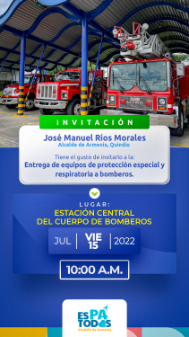Con una inversión de $1.529.574.000, hoy a las 10:00 a.m. en la estación central del Cuerpo Oficial de Bomberos, el alcalde de Armenia, José Manuel Ríos Morales, realizará la entrega a los bomberos del municipio de 30 equipos de protección personal especial para atender incendios que incluyen protectores faciales, chaquetas, guantes, botas, pantalones y cascos; 30 equipos de protección respiratoria; seis cilindros y seis botas para emergencias con materiales peligrosos.