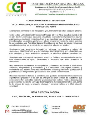 En comunicado prensa fechado 26 de abril de 2024, la Confederación General del Trabajo, (CGT), le dejó muy en claro al presidente Gustavo Petro, que no acudirá a su utilitaria convocatoria para marchar el próximo miércoles 01 de mayo.
