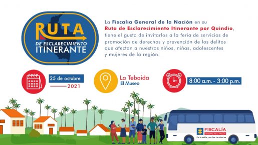Buscando que más personas puedan acceder a la administración de justicia y se logre fortalecer la lucha contra los delitos que afectan la seguridad ciudadana y los derechos de niños, niñas, adolescentes y mujeres; la Ruta Itinerante de la Fiscalía General de la Nación y el Programa de Prevención Futuro Colombia llegarán el próximo 25 y 26 de octubre a La Tebaida y Montenegro en el Quindío.