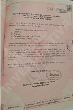 Este es el acta de Fecode donde consta que la donación iba para la campaña Petro Presidente. Foto tomada de El Tiempo