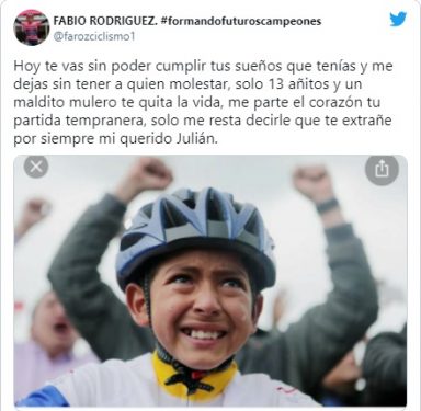 La noticia fue dada a conocer por Fabio Rodríguez, el exciclista que condujo el comienzo de la carrera de Bernal entre los 8 y 14 años, a través de su cuenta Twitter: “Hoy te vas sin poder cumplir tus sueños que tenías y me dejas sin tener a quien molestar, solo 13 añitos y un maldito mulero te quita la vida, me parte el corazón tu partida tempranera, solo me resta decirle que te extrañe por siempre mi querido Julián”.