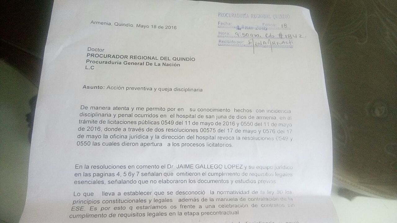 En la mañana de este miércoles 18 de mayo a las 9:50 AM, fue radicada la queja ante la Procuraduria Regional con el No 1842 y consta de 18 folios.