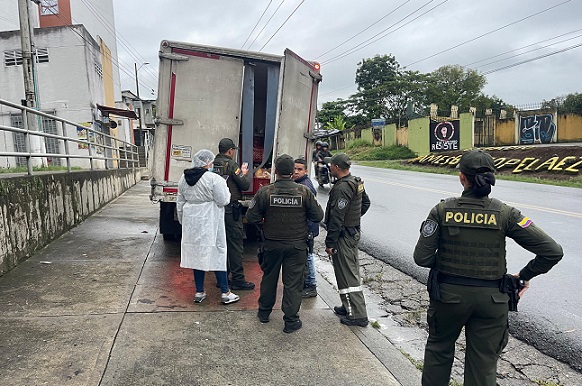Esta acción articulada se llevó a cabo en la vía que conduce al municipio de Alcalá, donde mediante puesto de control sanitario y de transporte de alimentos, unidades de la Seccional de Carabineros y Protección Ambiental, proceden a la verificación de un vehículo tipo furgón y al realizar la revisión documental exigida para el transporte de productos alimenticios, el conductor manifiesta no portar la guía sanitaria de movilización correspondiente.
