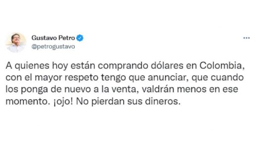 El presidente electo Gustavo Petro, de descanso en Italia, envió un mensaje con motivo de la incertidumbre que hay en Colombia con el precio del dólar. “A quienes hoy están comprando dólares en Colombia, con el mayor respeto tengo que anunciar que cuando los ponga de nuevo a la venta, valdrán menos en ese momento. ¡Ojo! No pierdan sus dineros”, escribió a través de su cuenta en Twitter.
