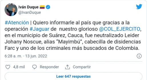 “Quiero informarle al país que gracias a la operación Jaguar de nuestro gloriosos Ejército Nacional, en el municipio de Suárez, Cauca, fue neutralizado Johany Noscue, alias ‘Mayimbú’, cabecilla de disidencias Farc y uno de los criminales más buscados de Colombia”.