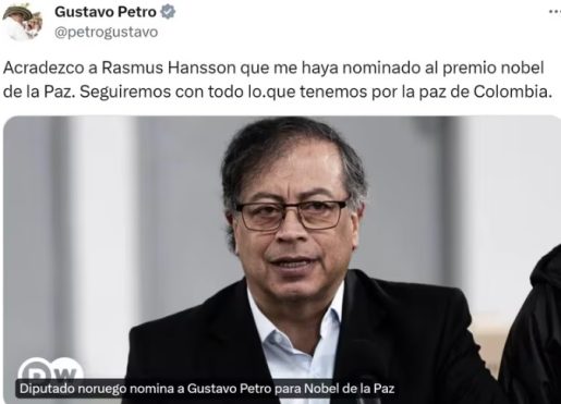 El presidente Petro agradeció a través de su cuenta oficial de la red social X la nominación hecha por el diputado. “Agradezco a Rasmus Hansson que me haya nominado al premio nobel de la Paz. Seguiremos con todo lo que tenemos por la paz de Colombia”, escribió el mandatario colombiano.