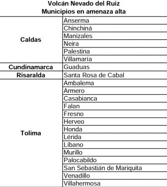 Vale la pena destacar que, un total de 22 municipios hacen parte de la zona de amenaza alta del volcán, sin embargo, las medidas de evacuación están destinadas para Villamaría, Casabianca, Herveo, Murillo y Villahermosa puesto que son los municipios más cercanos a los que se recomienda evacuar antes de ser confirmada una erupción por encontrarse ubicados en el radio de 15 kilómetros al cráter del Nevado del Ruiz.